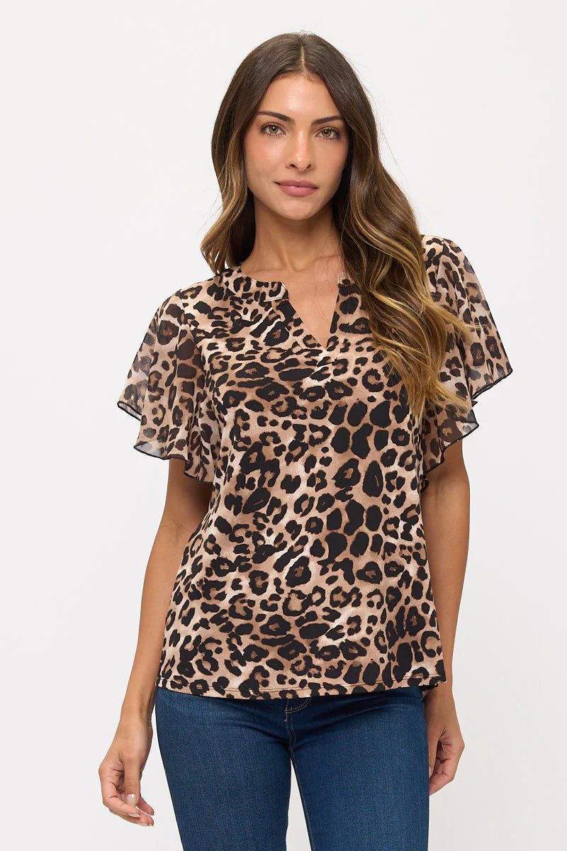 Our Animal Print Flutter Sleeve top boasts a V-neckline, delicate sheer ruffled flutter short sleeves, and a relaxed fit for effortless elegance and comfort. Wear loose or tucked in for a versatile look. Runs true to size.