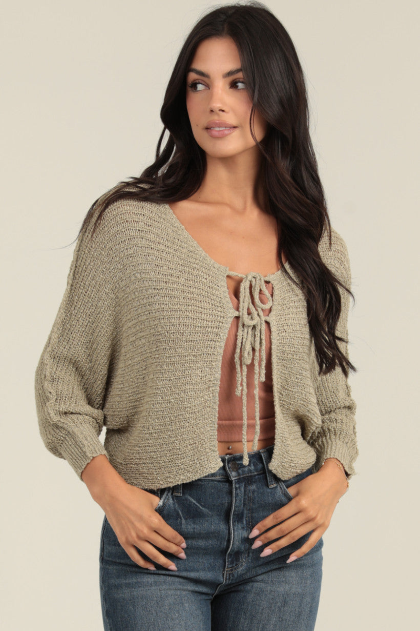 Elevate your style with this gorgeous Sage Cardi featuring two front ties that draw attention to your silhouette. The bat wing sleeves lend an effortlessly bold edge while the lightweight fabric ensures comfort and breathability. Perfect for layering, this cardigan combines modern flair with versatile wearability. Embrace your confident side and transform any outfit with this striking piece.